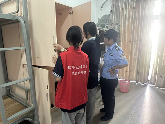 “請班主任整好隊”“各班按次序等待檢查”“請把皮箱、衣柜打開”……10月13日下午,諸暨技師學(xué)院安管處聯(lián)合諸暨市城東派出所對學(xué)生寢室開展了管制刀具等違禁物品突擊檢查。