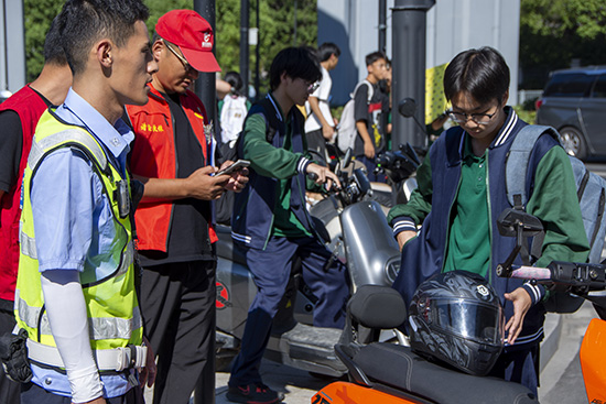 學校與諸暨市交警部門緊密聯動,將安全教育的課堂延伸到校門口,建立常態化合作機制。在上學與放學的高峰時段,交警們不僅全力疏導交通,更化身移動的“安全宣傳站”。他們特別強調必須年滿16周歲方可騎行電動車,并現場示范如何正確佩戴安全頭盔,提醒同學們騎行時不載人、不闖紅燈、不逆行,為平安出行筑起第一道防線。