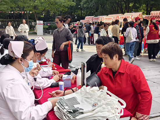活動當(dāng)天,社區(qū)鄰里坊熱鬧非凡,五大特色區(qū)域依次排開,每個角落都洋溢著敬老愛老的暖心氛圍。“桑榆情暖·便民服務(wù)區(qū)”提供免費縫補、磨刀、理發(fā)、小家電維修,把便利送到老人身邊;“健康同行·養(yǎng)生體驗區(qū)”集結(jié)健康咨詢、血壓測量、牙科義診、推拿按摩等服務(wù),搭配中藥養(yǎng)生問答,守護長輩安康;“匠心手作·文化傳承區(qū)”里,“艾”在重陽養(yǎng)生錘制作、“囊”情寄意茱萸香囊DIY同步開展,讓傳統(tǒng)手藝與養(yǎng)生智慧代代傳;“樂活時光·趣味游園區(qū)”的秋日投壺、果蔬套圈、吹球過河,讓老人們重拾童趣;“雅致文化角”則以拓印福字、宋代點茶品鑒,勾勒雅致重陽意境。現(xiàn)場還向參與老人分發(fā)傳統(tǒng)重陽糕,甜香里共享佳節(jié)滋味。