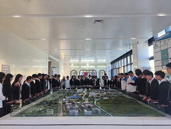 乘坐觀光車穿梭于眼谷園區(qū),沿途的建筑風貌讓學(xué)子們不時發(fā)出贊嘆。抵達中國眼谷超級眼視光醫(yī)院門口,一座精致的眼谷整體模型映入眼簾。工程師俯身講解,從整體規(guī)劃布局到主要建筑的分布,再到“以眼為核、聯(lián)動產(chǎn)業(yè)”的設(shè)計理念,層層拆解:“大家看,醫(yī)院建筑與科研樓的動線設(shè)計,是為了讓醫(yī)患、科研人員的交流更高效,這就是‘功能優(yōu)先’的設(shè)計邏輯。”學(xué)子們圍在模型旁,認真記錄,仿佛透過微縮景觀,看到了眼谷未來發(fā)展的藍圖。