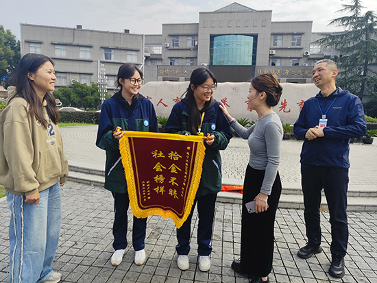 這份感動并未止步于電話。10月27日,失主女士專程來到海寧衛(wèi)生學(xué)校,將一面書寫著“拾金不昧 品德高尚”的錦旗送到了兩位同學(xué)手中,當(dāng)面向她們表達(dá)了誠摯的謝意。她說:“從這兩個孩子身上,我看到了海寧衛(wèi)校學(xué)生優(yōu)秀的品質(zhì)和良好的教養(yǎng),你們學(xué)校的育人成果,值得肯定!”