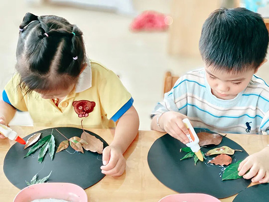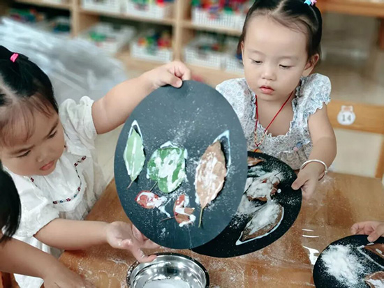霜降過后,園內樹葉換上五彩盛裝。老師和孩子們收集落葉,共同創作“霜降樹葉畫”:用面粉撒在各色落葉上,形成萬林盡染的美景,一片片普通的葉子在孩子們的巧手下煥發生機。這場創作不僅留住了秋天的美好,更讓孩子們在觸摸葉片紋理、搭配色彩的過程中,直觀感受霜降時節的自然之美。