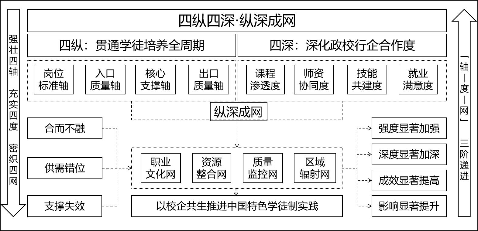 以“四縱四深·縱深成網(wǎng)”為框架,創(chuàng)新形成“軸-度-網(wǎng)”三級遞進(jìn)育人體系。通過強(qiáng)壯崗位標(biāo)準(zhǔn)軸、入口質(zhì)量軸、核心支撐軸、出口質(zhì)量軸奠定育人根基,圍繞課程、師資、技能、就業(yè)四維度深化校企融合,最終構(gòu)建職業(yè)文化、資源整合、質(zhì)量監(jiān)控、區(qū)域輻射四張產(chǎn)教網(wǎng),為中國特色學(xué)徒制技能人才培養(yǎng)的成功實踐凝聚了要素。
