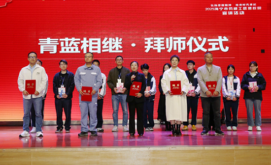 活動中,“青藍(lán)相繼?拜師儀式”成為一大亮點(diǎn)。浙江省優(yōu)秀技能人才張磊、中國皮革行業(yè)杰出設(shè)計師盧薪羽、全國勞模沈建利、海寧市“最美職工”劉闖、嘉興良匠周華標(biāo)五位勞模工匠,分別與海寧市職業(yè)高級中學(xué)技能大師工作室的師生代表結(jié)對。勞模代表沈建利寄語徒弟們“以匠心守初心,以實(shí)干筑夢想”,徒弟代表也表態(tài)將虛心求教、刻苦鉆研,傳承工匠精神。