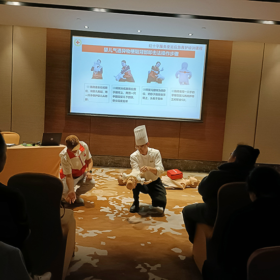 本次培訓特邀浙江省紅十字會一級應急救護師丁柏偉進行授課。針對酒店行業的工作特性,丁老師重點講解了氣道異物梗阻的發生機理、易發人群識別及現場救護方法,并系統教授了心肺復蘇(CPR)的技能要點。