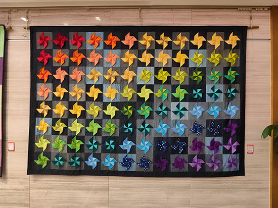 作品《等風(fēng)來》以拼布藝術(shù)為媒介,通過漸變色布料的巧妙裁剪與拼接,構(gòu)筑出一組立體旋轉(zhuǎn)的風(fēng)車陣列。由深入淺的色調(diào)過渡,暗喻時(shí)光流轉(zhuǎn)與鄉(xiāng)村生活的詩意變遷。當(dāng)微風(fēng)輕拂,布面隨風(fēng)起伏,形成獨(dú)特的動(dòng)態(tài)視覺效果,仿佛風(fēng)車正悠然轉(zhuǎn)動(dòng),靜候美好生活的佳音。每一片風(fēng)車葉皆由學(xué)員親手縫制,針線間承載著居民對(duì)幸福生活的期盼與信心,傳遞出“等風(fēng)來,即是等希望”的溫暖主題。