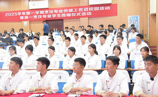 白帽挺括映初心,誓言鏗鏘振人心。11月10日下午,杭州市良渚職業高級中學烹飪部以“匠心領航啟新程,冠帽明志鑄廚魂”為核心主題,舉辦2025級烹飪專業授帽儀式暨勞模工匠進校園活動,將勞模精神傳承、職業身份認同與技藝實操指導深度融合。浙江省勞動模范、中國烹飪大師名人堂導師、國家技能鑒定中心專家委員會委員李林生親臨現場,為25級中餐、中西點心、西餐班全體新生授帽、開講、評作,讓“以德為本、德技并修”的職業種子,在青春灶臺旁落地生根。