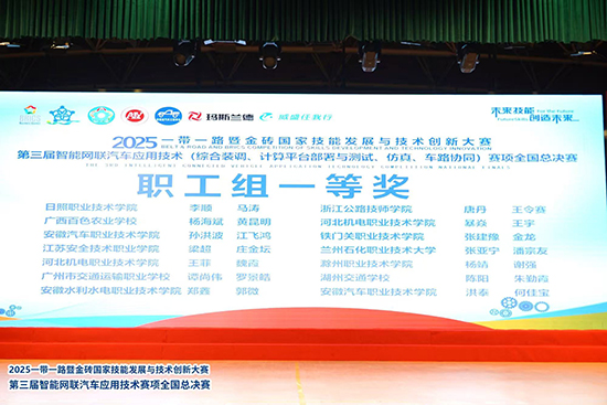 2025一帶一路暨金磚國家技能發(fā)展與技術(shù)創(chuàng)新大賽第三屆智能網(wǎng)聯(lián)汽車應(yīng)用技術(shù)賽項全國總決賽于11月7日至9日在安徽汽車職業(yè)技術(shù)學院舉行。湖州交通技師學院教師團隊憑借扎實的專業(yè)功底、默契的團隊協(xié)作與出色的臨場發(fā)揮,一路過關(guān)斬將,成功斬獲職工組一等獎(金牌)。