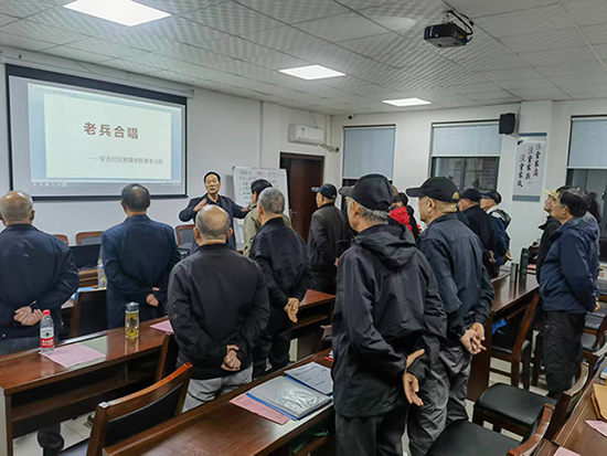 當(dāng)晚7時,培訓(xùn)正式拉開帷幕。授課教師張鶴鳴剛走上講臺,便被眼前的場景打動:30名老兵自發(fā)列隊,雙腳分開與肩同寬,雙手后背相握,跨立的姿態(tài)整齊劃一,仿佛重回軍營時光。“這首歌是咱們老兵的心聲,唱的時候要帶著對黨的忠誠、對軍隊的熱愛!”張老師先詳細講解《人民軍隊忠于黨》的創(chuàng)作背景,從戰(zhàn)火紛飛的歲月講到和平年代的堅守,讓老兵們再次感受歌曲里的紅色情懷。